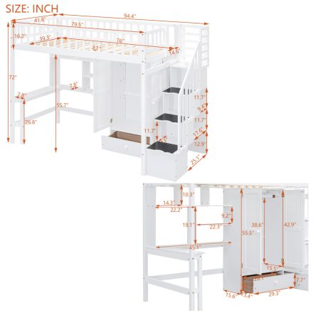 / Twin size Loft Bed with Bookshelf,Drawers,Desk,and Wardrobe-White